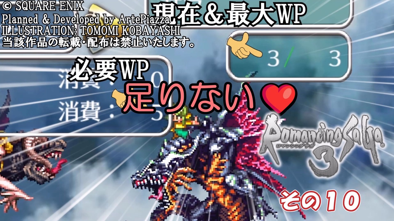 この動画はスチーム版ロマンシング・サガ3のかるーい縛り実況動画です。<br><br>●縛り?内容<br>・サラは控えでコマンダーモードオンリー<br>(ごく一部の戦闘では強制参戦させられるため術攻撃許可)<br>・パーティメンバーの武器や術は指定のみ使用(メンバー揃ったので記載)<br>ネコ耳(代理:少年→吸血鬼) 斧・棍棒・大剣・弓・特殊(吸血鬼技)<br>43(代理:ユリアン)二刀流できればなんでもOK(銀の手を必ず装備)<br>490(代理:エレン)素手・火術・太陽術<br>イクシース(代理:ミューズ)剣・大剣・小剣<br>ミント(代理:モニカ)弓・土術・月術<br><br>※43ちゃん、490姉さんは470/43様のオリジナルキャラクターです<br> 参考動画:<a href="https://www.nicovideo.jp/watch/sm40839724" class="watch">sm40839724</a> <a href="https://www.nicovideo.jp/watch/sm44979749" class="watch">sm44979749</a><br>※イクシース、ミントはろーぐ様のオリジナルキャラクターです。<br> 参考動画:<a href="https://www.nicovideo.jp/watch/sm42425613" class="watch">sm42425613</a><br><br><a href="https://www.nicovideo.jp/watch/sm45854719" class="watch">sm45854719</a> ← 前 次 → <a href="https://www.nicovideo.jp/watch/sm45880996" class="watch">sm45880996</a><br>マイリスト →<a href="https://www.nicovideo.jp/mylist/70943031" target="_blank" rel="noopener">mylist/70943031</a><br><br>※使用Voice(及び配役)<br>VOICEVOX:春日部つむぎ(ネコ耳) (きりたん)四国めたん(イクシース) No.7(ミント・490)<br>CoeFont:アリアル(Voiced by <a href="https://CoeFont.cloud" target="_blank" rel="noopener nofollow">https://CoeFont.cloud</a>(490))<br>立ち絵:ネコ耳(470/43様より頂きました)<br> 43・490(470/43様自作)<br> イクシース・ミント(からい先生のめたち絵)<br><br>© SQUARE ENIX<br>Planned & Developed by ArtePiazza<br>ILLUSTRATION: TOMOMI KOBAYASHI<br>当該作品の転載・配布は禁止いたします。