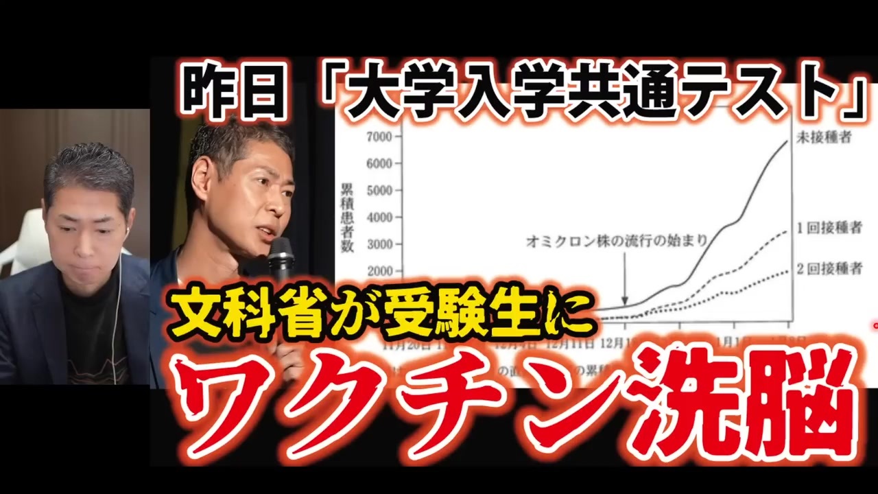 元の動画 → <a href="https://youtu.be/Mir7ClriPd8?t=9" target="_blank" rel="noopener nofollow">https://youtu.be/Mir7ClriPd8?t=9</a><br>2026/01/19 にライブ配信<br>00:00 オープニング:共通テスト生物基礎に「トモデモ問題<br>01:20 ニュース記事の紹介:接種歴別の感染率を問う出題<br>03:08 実際の入試問題とグラフの解説(正解は「未接種が悪い」?)<br>08:35 元ネタはCDCの研究:そのデータに隠された「からくり」<br>10:33 トリック①:接種後「魔の2週間」は未接種扱い<br>11:46 トリック②:検査バイアス(未接種者は週1で検査)<br>15:04 日本でもあったデータ不正(厚労省 未接種者陽性率捏造事件)<br>19:23 歴史的映像:岸田総理 若者へ3回目接種推奨メッセージ<br>21:21 データ訂正後に起きた「逆転現象」(打った人ほど感染)<br>24:56 河野太郎氏「データの直しがあっても有効性は変わらない?<br>27:37 ワクチン接種数とコロナ陽性者数の相関グラフ<br>31:34 浜松市の「全数把握データ」が示す不都合な真実<br>35:32 コロナワクチン接種後の死亡認定数(1000名超)について<br>37:50 エンディング:明日の大臣会見に向けて<br><br>今回の動画の関連資料<br>・共通テスト生物基礎で「新型コロナ」出題 ワクチン接種回数別のデータから免疫の仕組みを問う<br><a href="https://news.yahoo.co.jp/articles/0f0..." target="_blank" rel="noopener nofollow">https://news.yahoo.co.jp/articles/0f0...</a><br><br>・CDCのレポートはこちら<br><a href="https://www.cdc.gov/mmwr/volumes/71/w..." target="_blank" rel="noopener nofollow">https://www.cdc.gov/mmwr/volumes/71/w...</a><br><br><br>❑藤江の講演等の予定はこちら<br><a href="https://nicochannel.jp/fujie/articles..." target="_blank" rel="noopener nofollow">https://nicochannel.jp/fujie/articles...</a><br><br>❑2025年4月22日 書籍発売<br>「おかしくないですか⁉ 日本人・謎の大量死──知ってください、衝撃の事実」<br><a href="https://amzn.to/424jnwO" target="_blank" rel="noopener nofollow">https://amzn.to/424jnwO</a><br><br>Amazonアソシエイトプログラムに参加しています。<br><br>―――――――――――――――――<br><br>❑藤江の「真の」日本人増加計画(ニコニコチャンネル+)<br><a href="https://nicochannel.jp/fujie/" target="_blank" rel="noopener nofollow">https://nicochannel.jp/fujie/</a><br>※毎月第3土曜日の夜、定例ライブ配信!<br><br><br>❏藤江の活動を支援していただける方向け<br>【藤江支援口座】のご案内<br>住信SBIネット銀行 ミカン支店(店番号103)<br>口座番号 3107694<br>口座名義 フジエ マサミツ<br><br><a href="https://www.youtube.com/@FUJIE4" target="_blank" rel="noopener nofollow">https://www.youtube.com/@FUJIE4</a><br>四海兄弟【藤江4thチャンネル】