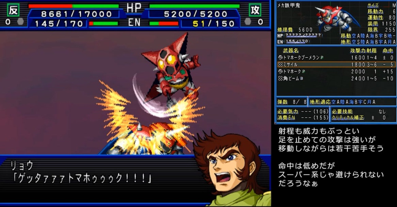 | 460 | 0:34 | 2026/01/25 19:01 | - | 0 | 0 | 通常なら全地形対応のゲッターかボスキラーのグレートかの二択になるけどボスはどうにでもなるからやっぱゲッターかな | ||
