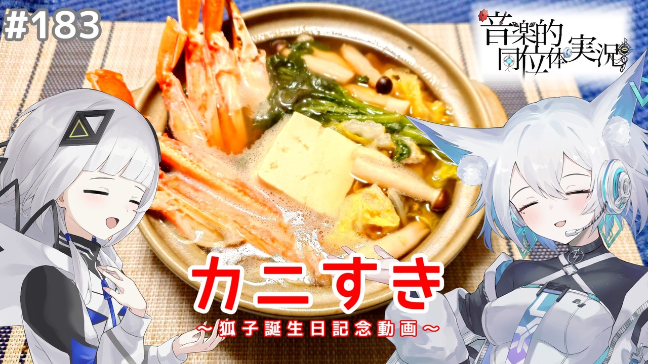 183品目。<br><span style="color: #ff0000;"><strong>1月25日は狐子ちゃんの誕生日。</strong></span><br>もうデビューから3年が経ったと思うと時の流れは本当に早いですね…<br>そんなめでたい日を、今年はカニすきでお祝いします。<br>冬の味覚、何だかんだ食べるのは久しぶりです。<br><br>可不の調理実習室のマイリストはこちらから:<a href="https://www.nicovideo.jp/mylist/74018156" target="_blank" rel="noopener">mylist/74018156</a><br><br>コメントやいいね、チャンネル登録して頂けると喜びます!<br><br>投稿者のYoutubeチャンネルはこちらから→<a href="https://www.youtube.com/@afterglow9702" target="_blank" rel="noopener nofollow">https://www.youtube.com/@afterglow9702</a><br><span style="color: #ff0000;">※普段使用していたX(旧Twitter)が凍結されました…<br>新告知用のアカウントもフォローお願いします!</span>→<a href="https://x.com/sunrisefreeze" target="_blank" rel="noopener nofollow">https://x.com/sunrisefreeze</a><br><br>使用ツール:NodoAme(作:いぬいぬGames様 <a href="https://www.nicovideo.jp/watch/sm98013232" class="watch">sm98013232</a>)<br>演技指導:可不→すずきつづみ(Cevio AI)<br>立ち絵:はゆ茶様 <a href="https://www.nicovideo.jp/watch/sm39971378" class="watch">sm39971378</a> <a href="https://seiga.nicovideo.jp/seiga/im10877460" target="_blank" rel="noopener">im10877460</a><br> misho様 <a href="https://seiga.nicovideo.jp/seiga/im11363828" target="_blank" rel="noopener">im11363828</a><br>可不・狐子イラスト:らいす様 <a href="https://twitter.com/rice01200120" target="_blank" rel="noopener nofollow">https://twitter.com/rice01200120</a><br>シリーズロゴ:misho様<br>BGM:騒音の無い世界様(コンテンツツリー参照)<br>SE:効果音ラボ様 <a href="https://soundeffect-lab.info" target="_blank" rel="noopener nofollow">https://soundeffect-lab.info</a><br><br>※今回のレシピはマルツ様を参考にしています。